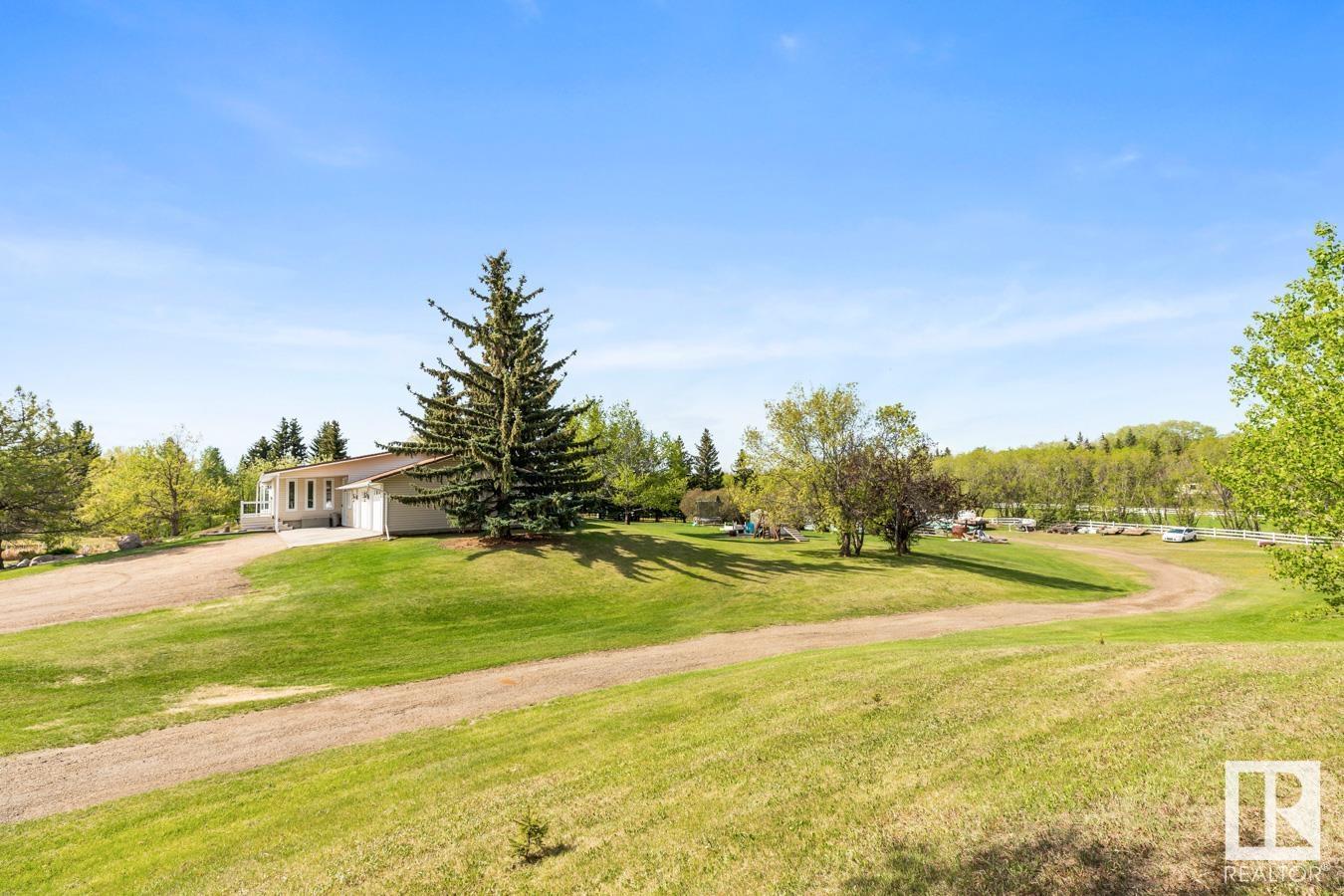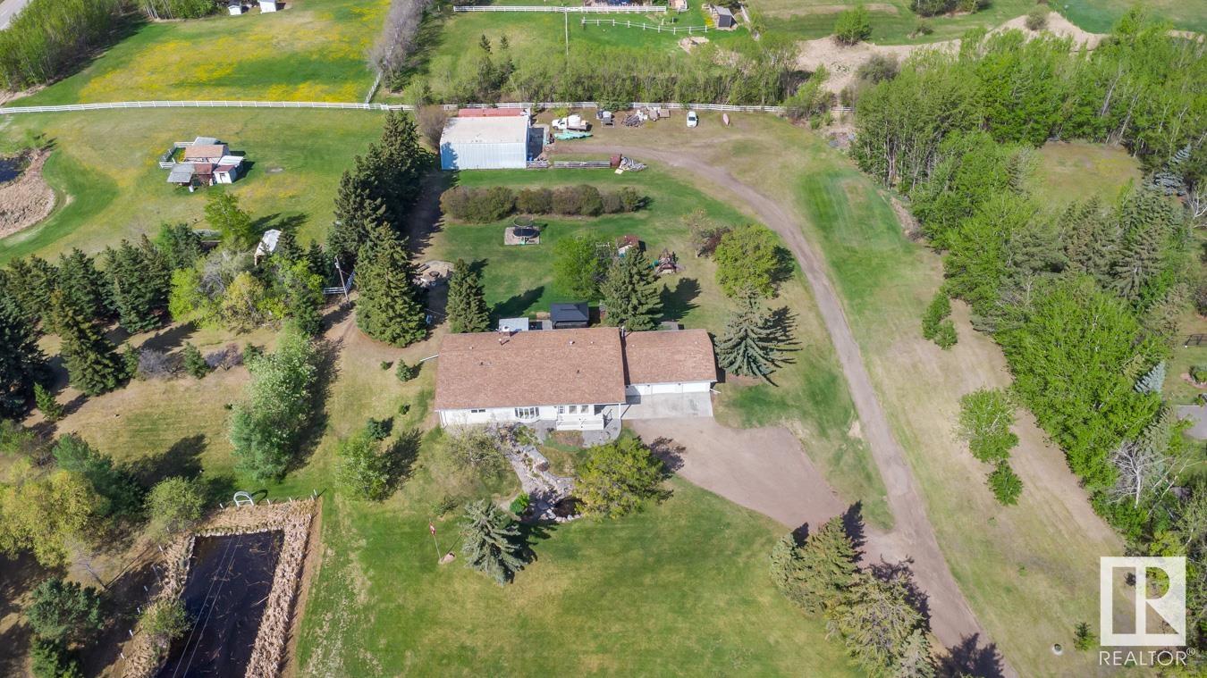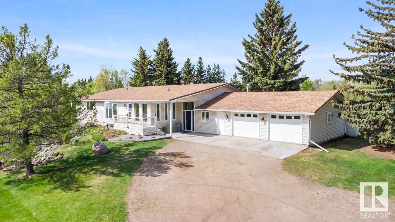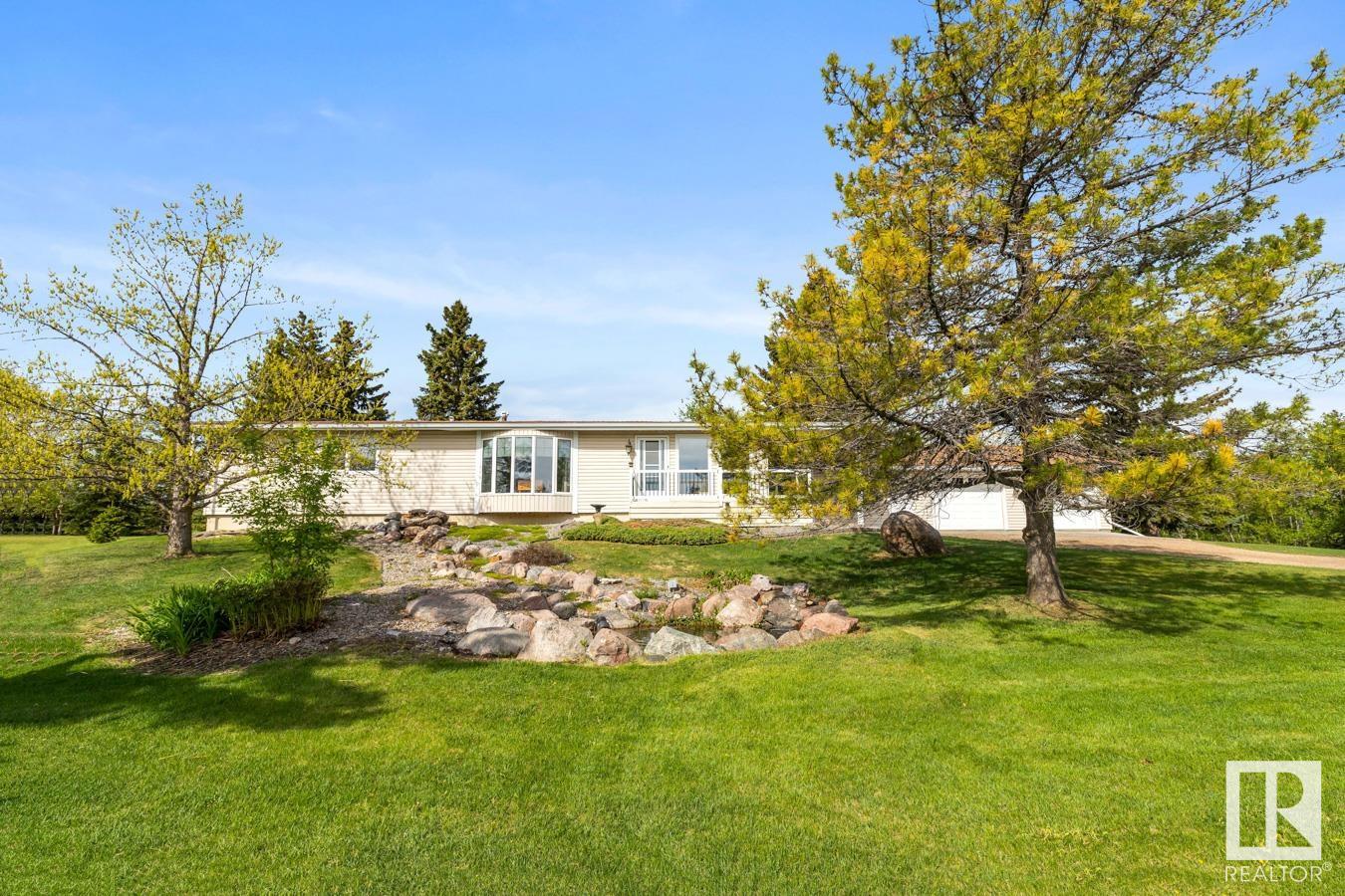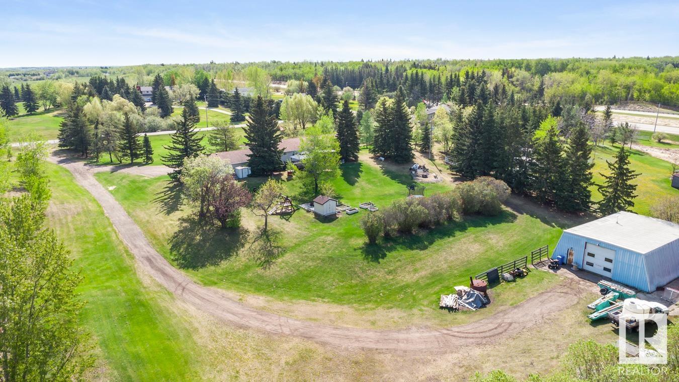Welcome to your own PRIVATE retreat, just 2 mins from Sherwood Park, featuring a HEATED 40×50 shop, DOUBLE garage, 4 bedrooms & 3.5 baths, tucked onto 2.99 acres surrounded by trees in Sherwood Place. You are welcomed in to find a spacious entry with vinyl flooring that leads to a family sized kitchen that offers plenty of cabinets, NEW S/S appliances & island that overlooks the dining & living room with fireplace. Plenty of natural light in breakfast nook & family room. Awesome king sized primary suite with den, WI closet & 3pc ensuite. 2 more bdrms are both generous in size, 4pc bath & guest bath complement the functional layout. Moving down to the finished basement there is a huge rec room with laminate flooring, large 4th bdrm, UPDATED 3pc bath with sauna, laundry & tons of storage. NEW light fixtures & carpet. LOVE the peace & quiet in the yard with water features, entertaining sized deck, swim spa & raised gardens. DREAM SHOP with 12′ door & 220 power. Beautiful & move in ready!